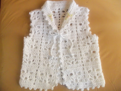 CHALECO CALADO TEJIDO AL CROCHET, CON ROCOCO EN SOLAPA.